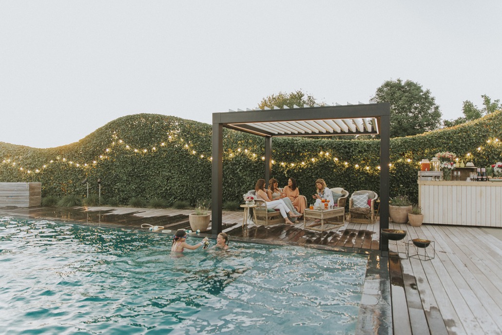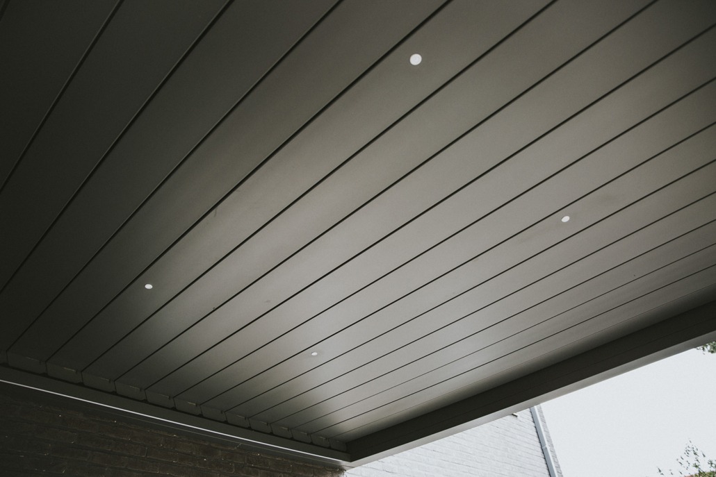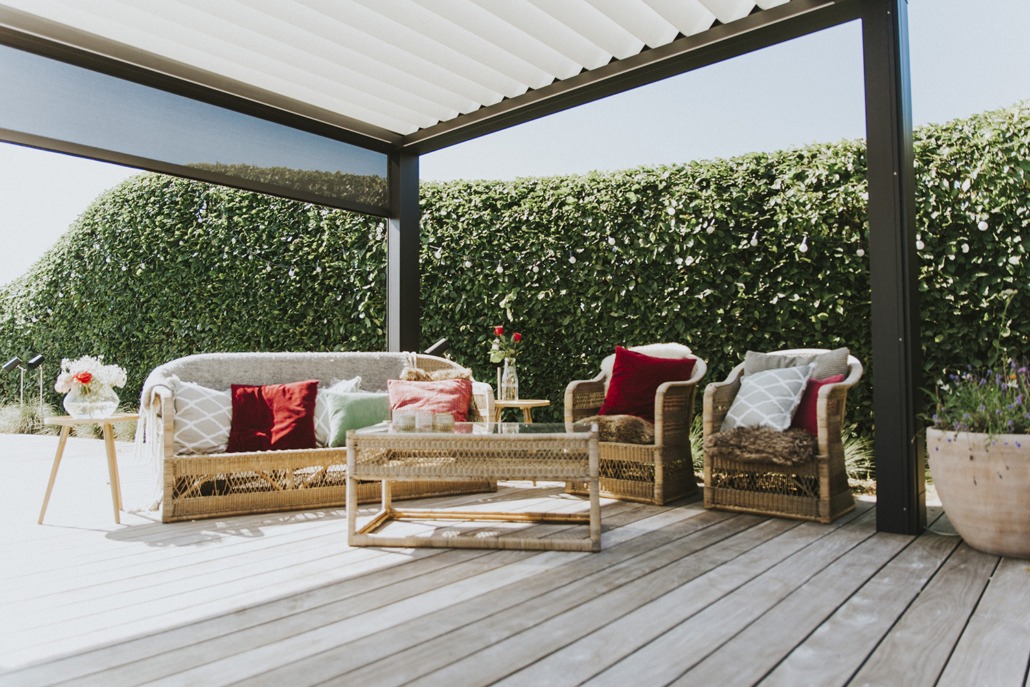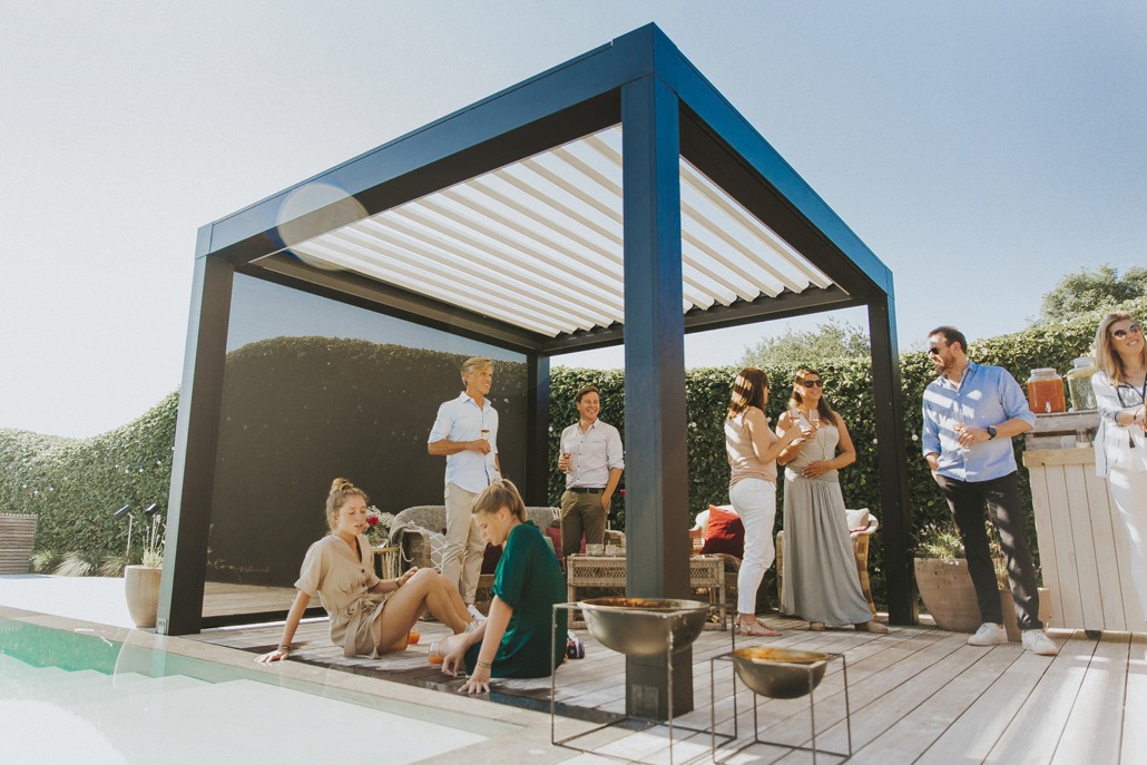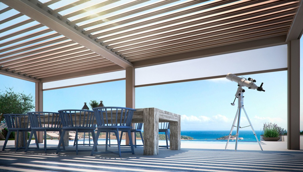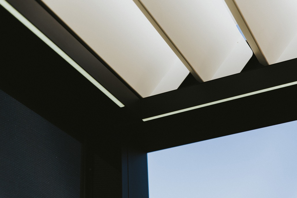 De lamellen zijn 140° kantelbaar en laten u kiezen tussen een waterdicht gesloten dak of zon op het terras. Het regenwater wordt afgevoerd via een ingebouwd systeem.