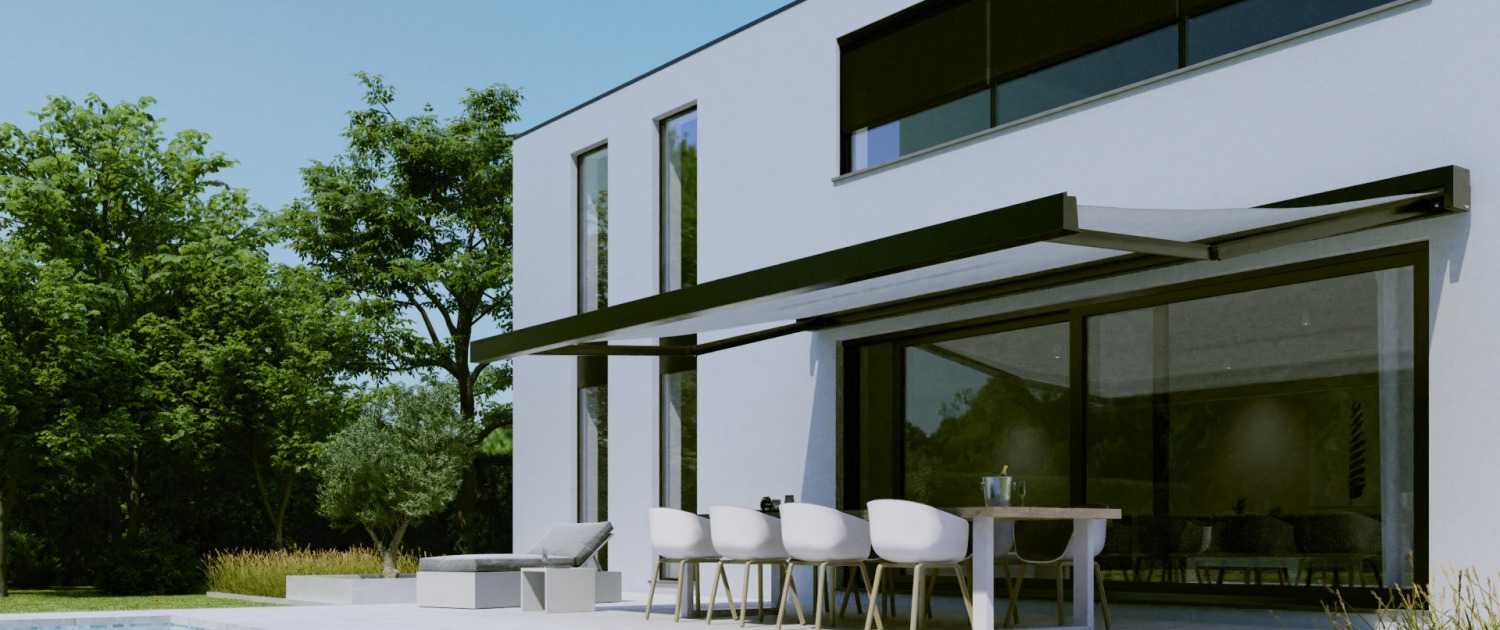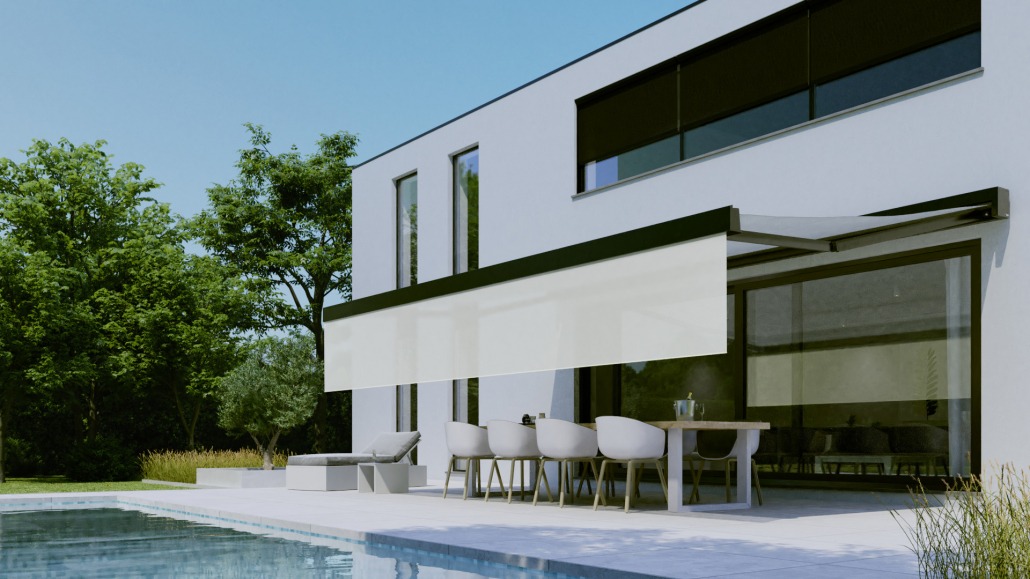 Dit strak vormgegeven zonnescherm past bij elke bouwstijl. Zijn minimalistisch design biedt de mogelijkheid om verlichting en variovolant te integreren.