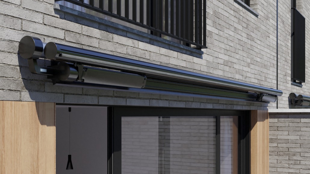 De electrische variovolant die tot 2 m kan zakken beschermt tegen laagstaande zon, wind en regen.